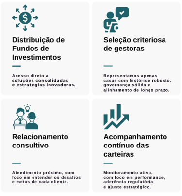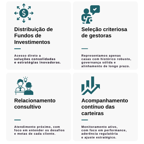 Conectamos nossos clientes às mais variáveis soluções de investimento através de gestoras de renome no mercado financeiro.